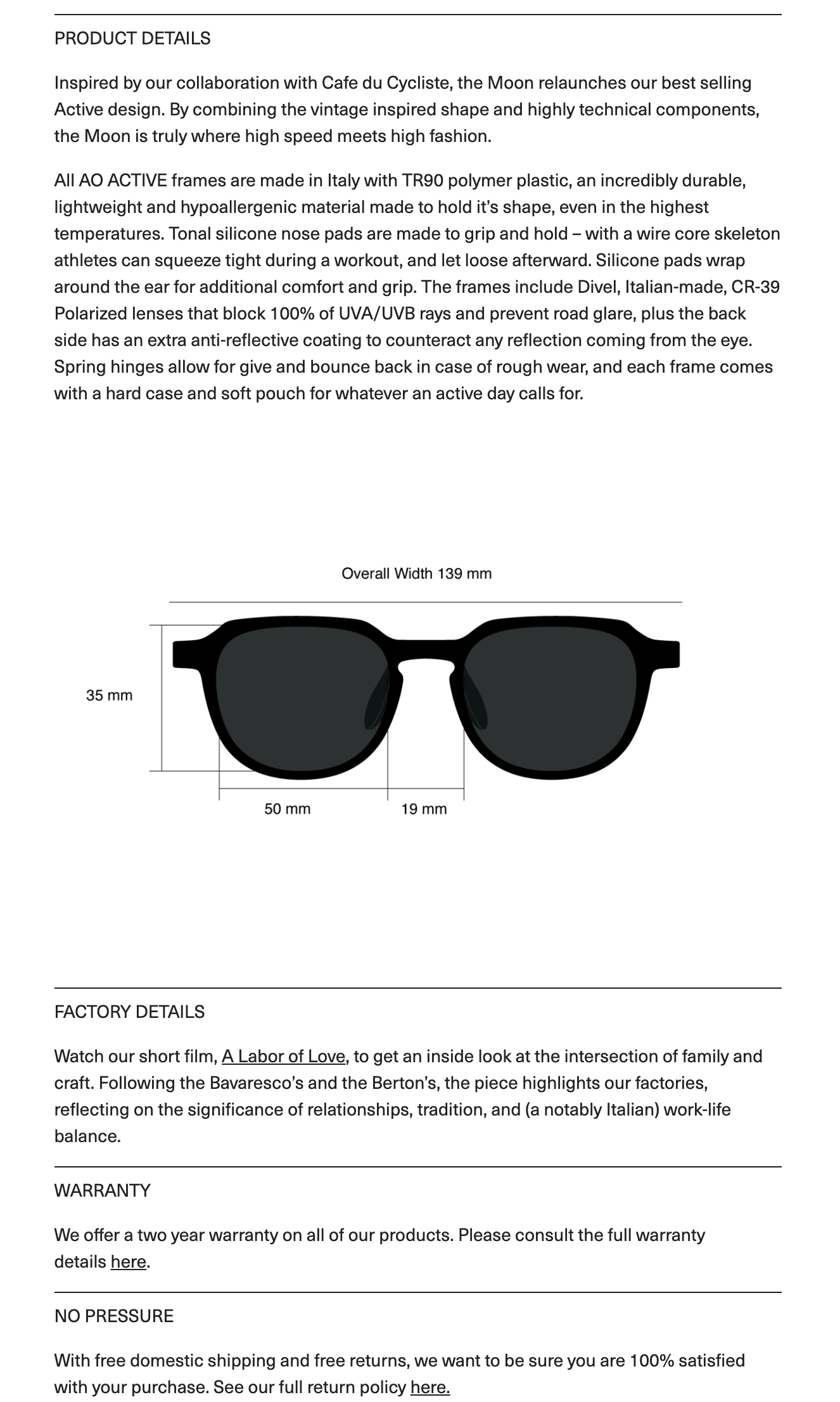 프레임에는 UVA/UVB 광선을 100% 차단하고 도로에서 눈부심을 방지하는, 이탈리아 디벨(Divel) 브랜드의 CR-39 편광 렌즈가 포함되며, 렌즈 뒷면에는 추가적인 반사를 막아주는 방지 코팅이 있습니다.