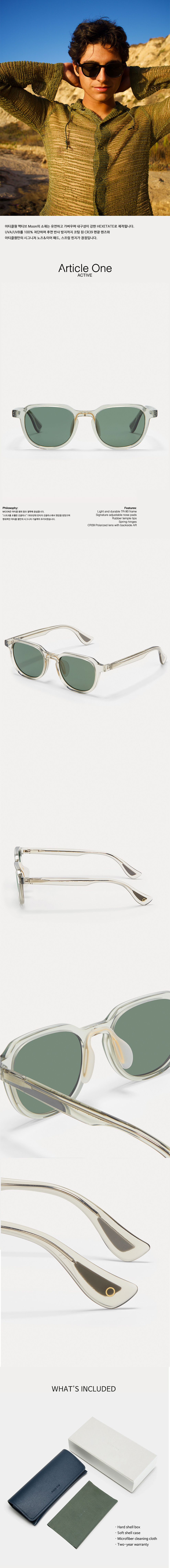 프레임에는 UVA/UVB 광선을 100% 차단하고 도로에서 눈부심을 방지하는, 이탈리아 디벨(Divel) 브랜드의 CR-39 편광 렌즈가 포함되며, 렌즈 뒷면에는 추가적인 반사를 막아주는 방지 코팅이 있습니다.