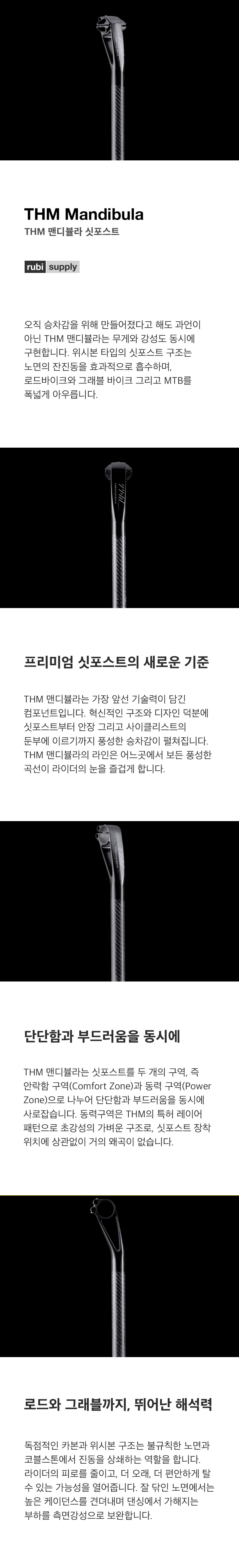 THM에서 새롭게 선보이는 카본 싯포스트, THM 맨디뷸라는 업계에서 가장 앞선 기술력이 담긴 컴포넌트입니다. 혁신적인 구조와 디자인 덕분에 싯포스트부터 안장 그리고 사이클리스트의 둔부에 이르기까지 풍성한 승차감이 펼쳐집니다. THM 맨디뷸라의 라인은 어느곳에서 보든 풍성한 곡선이 라이더의 눈을 즐겁게 합니다.